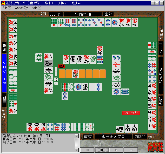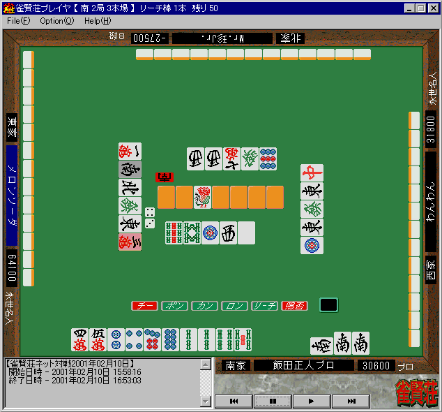 飯田プロが しかし、ソーズが伸びることなく、先にテンパイが入ったことに、「行け!」という声を聞いたのでしょう。ここでメロンソーダ氏は即リーチしたのです。 その瞬間、飯田プロはしまったという顔をしつつも、当然のように危険牌をノータイムでツモ切りしつつ突っ張ります。いつもはネコのように慎重な飯田プロですが、この局が勝負所であることを重々感じ取っていました。だからこそ、この局はなおさら慎重に打っていたのですね。 決着がつくまでに時間はかかりませんでした。なんと、メロンソーダ氏の一発ツモ(!)という幕切れになったのです(牌図4)。 |