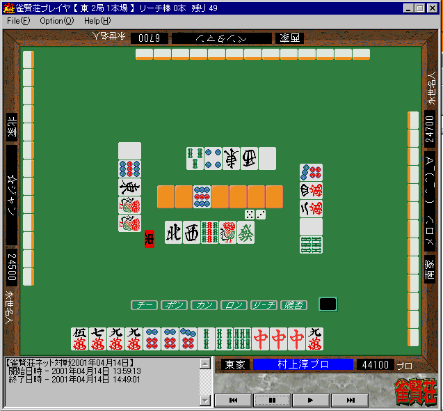 ■1回戦目 東1局3巡目、村上プロの手牌はこんな具合になりました。 ドラ ここで村上プロの打牌は。 このとき、ドラの切りはまだ早いとすれば、という三つのカンチャンから、どれかひとつを外すことになります。そこで村上プロはを選んだというわけです。これは気分で決めているのではなく、同じ手牌が100回来たら、100回ともを切ることでしょう。それは、こういったメカニックな理由によるのです。 まずは、リャンメンに変わる牌が、と2種類あるため、もっとも有望です。そこでとの比較になりますが、とではの方が他人の手牌からあふれやすいため、こちらを狙った方がアガりやすくなるのです。 3と7の牌はキー牌と言われ、その外側である1289への出口となっています。その結果として、3・7牌の内側はメンツを構成する上で使い勝手がよく、すなわち危険度が高くなります。ということは、手作りするためには34567の牌が重要ですが、最終的な待ちとしては、外側である1289の牌がアガりやすいのです。 ですから、カンチャンを選択するときには、やよりもやを残した方がいいわけです。こういった地道な発想を積み重ねていくことが、デジタル戦術と言えるでしょう。 ドラ この局、村上プロはこの手牌から、7巡目にをチー。すぐにをツモって、1000点をアガりました。まずは快調なスタートです。 東2局、親を迎えた村上プロにこんな配牌が入りました。 同じ色の牌が8枚あったらチンイツを意識しろと言いますが、ゾロッと10枚のピンズが入っています。ここにを引いたところで、5巡目、上家の☆ジャン氏がを切りました。村上プロの手牌はこうなっています。 村上プロはこのをカンチャンでチーしようとしました。あと2枚引けば九蓮宝燈のテンパイだというのに、ずいぶん夢のない打ち方です。しかし村上プロは、夢や品格は自分の麻雀に不要だと考えているのですね。勝ってこそプロであると考えるなら、確かにその通りです。 けれども、ここが彼の強運なところですが、のチーには何通りかの鳴き方があるために、チーする牌の指定に手間取って、結局、このをチーできなかったのです(マウスにさわるのは、大学2年の授業以来とのことでした)。 すると、すぐにと引いて、7巡目にペン待ちで、テンパイしたではありませんか。 さらに9巡目にを引き、の3メンチャンに変わりました。なら一通がついて文句なしのバイマン。でもイーペーコーがつくため、ツモればバイマンとなります。 このとき、捨牌はこうなっていました。 このまましっかりとダマテンで、ペンタマン氏の切ったで「ロン」。親のハネマンですから、1万8000点です。 まるで麻雀漫画のようなアガリ手です。9巡目のこんなダマテンに振り込んでしまうとは、ペンタマン氏はお気の毒としか言いようがありません。 これでダントツとなった村上プロを、次局、デジタル打法の真価を問う「何切る!?」の難問が襲います(図1)。