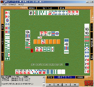 | 場に見えている関連牌は この親で連荘を続けるのが崎見プロに残された願いですが、続く2本場、なんとパソコンが落ちてしまい、その間に、早くも2巡目にして唯我独損氏からリーチが入っていました。しかもダイウチ君は国士を狙って、バラバラ配牌からいきなりど真ん中の 崎見プロはブツブツいっていましたが、それも無理からぬところでしょう。大事な親番に接続が切れてしまい、その間にデタラメな牌を切られているのです。しかもリーチまで入っている。ネット対戦を初めてする人にとっては納得しがたい事態でしょう。崎見プロはアガリに向かわない亜空間チー(流れを変えるためのチー)をしましたが、すぐ唯我独損氏に振り込んでしまいました。 こうして1回戦は終了。唯我独損氏が万全のトップ。ありゃ馬氏が2着で、ハリー氏が3着。崎見プロはダンラスです。 |