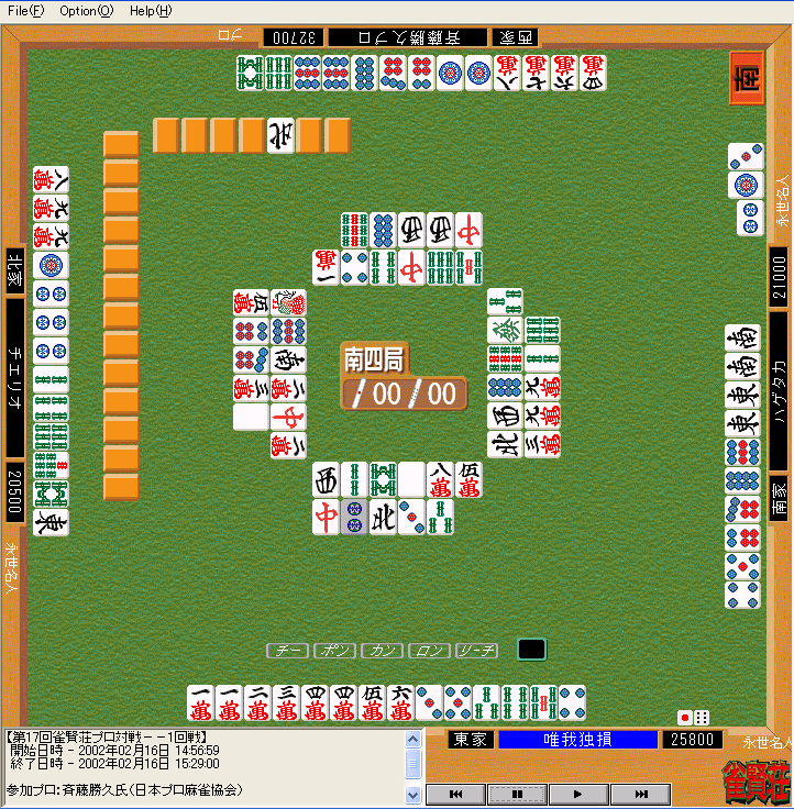けれども結果から見るならば、このアガリで逆転しなかったことにより斉藤プロのト ップが決まったのでした。やはり幸運の女神は前髪だけ。唯我独損氏はこの局に賭ける カウンター作戦を取ったのですから、ここは一発で決めなければならなかったのです。